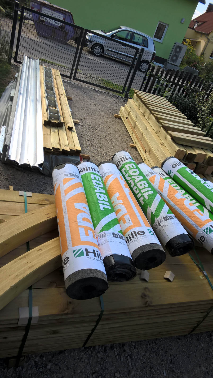 Nach der Bestellung und kurzer Abstimmung mit einem Mitarbeiter des Portals erhielten wir dann auch schon den Fundamentplan und eine Anleitung. Diese war als Fließtext, teilweise mit Bildern, geschrieben aber sehr generisch gehalten. Da wir die H-Anker für die Pfosten auch mitbestellt hatten, mussten wir noch bis zur Lieferung warten. Lieferzeitraum war mit 4-5 Wochen angegeben und das passte auch ziemlich gut. Ende August bestellt kam in der letzten Septemberwoche die Lieferung per Spedition. Immerhin 2,5t an Holz und Montagematerialien verteilt auf 3 Paletten.