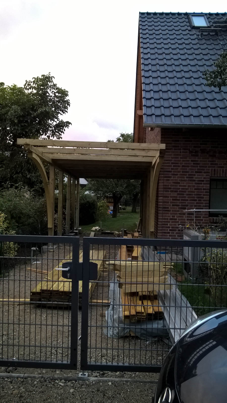 Zuerst einmal wurden die Pfosten entsprechend dem gewünschten Gefälle von 3° zurecht gesägt, vorgebohrt und aufgestellt. Das war noch der einfachere Part, da sich Holz und Montagematerial einfach identifizieren ließ. Gleiches galt auch noch für die Tragpfetten. Hier waren wir aber froh zu viert zu sein, da die Pfetten vorne am Carport wegen der Bögen (die erst später montiert wurden) nur auf 2 Pfosten auf. Entsprechend haben 2 Leute den Balken festgehalten, ein weiterer Anweisungen zur Ausrichtung gegeben und der Vierte dann die Schrauben festgezogen. Und dann war auch schon der halbe Tage rum.