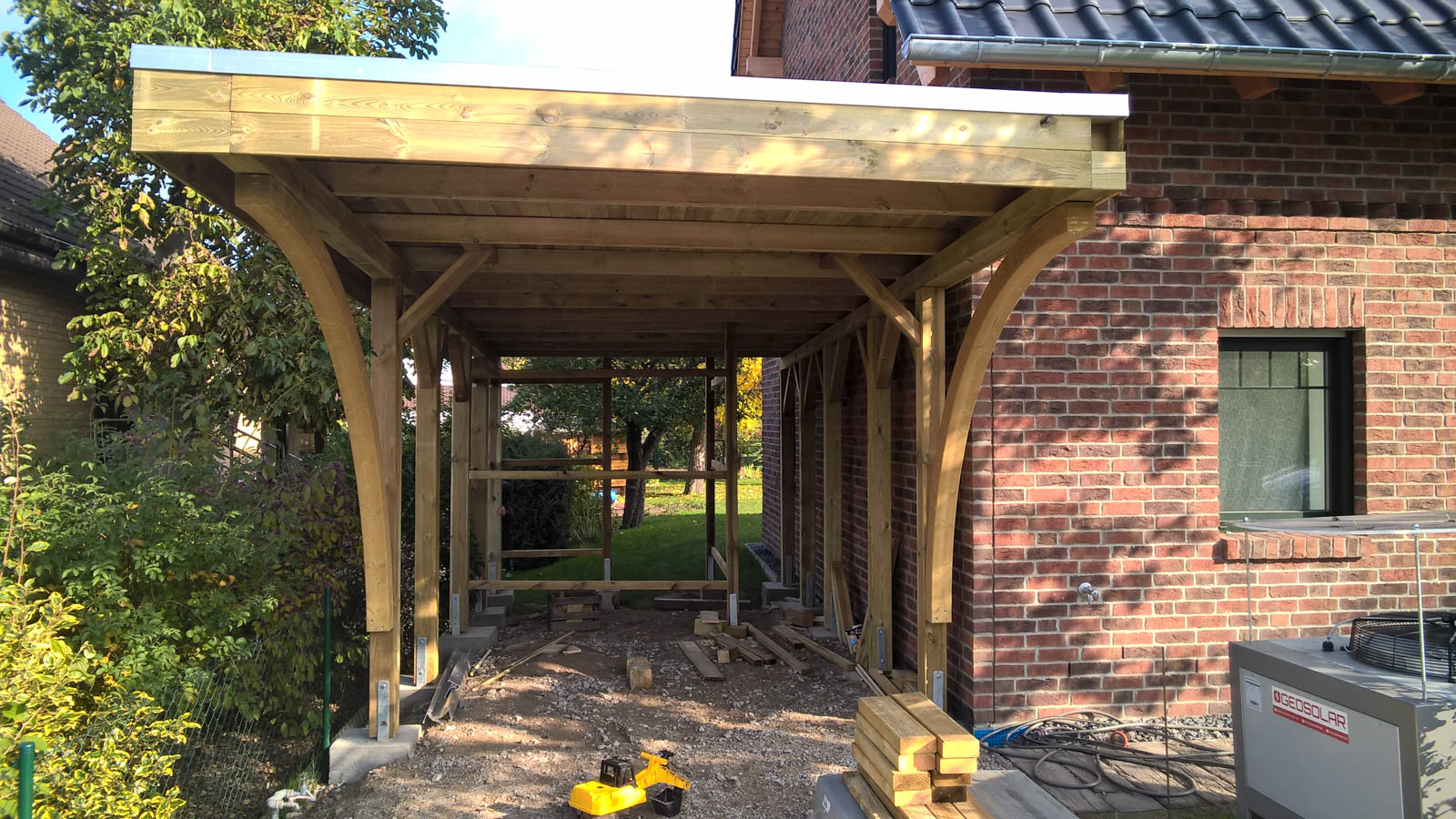 Der erste Aufbautag war gefühlt auch der letzte mit gutem Wetter, zumindest bis zum Abend, gewesen im Oktober. Dadurch, dass es an den Wochenenden immer nur mal kurzzeitig nicht geregnet hat, ging der weitere Bau nur sehr schleppend voran. Die Wahl der KDI Bretter ohne Nut & Feder erwies sich von der warte her auch als richtig, weil das einiges an Wasser abbekam, bevor es dann durch die Dachpappe später abgedeckt wurde. Allerdings bedeutete das auch, dass das Wasser trotzdem zwischen den Brettern durchlief und man damit auch nichts unter dem Caport weiterbauen konnte bei Regen.