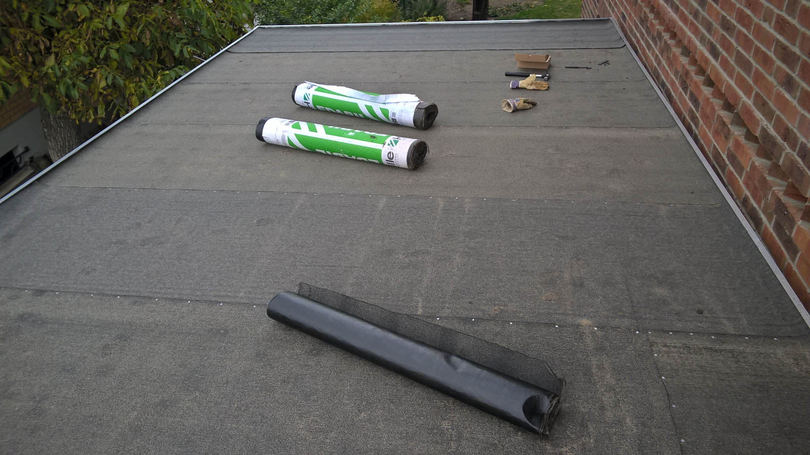 Während wir bisher bei allen Materialien exakt die benötigte Menge oder mehr hatten, waren die Schweißbahn und Dachpappe extrem knapp berechnet. Vermutlich wurden nur die m² herangezogen und keine Überlappung sowie Verschnitt durch feste Bahnenlängen bedacht. Bei der ersten Schicht Dachpappe war etwas Stückwerk ja noch ok, aber bei den Schweißbahnen wollte ich natürlich komplett durchlaufende Bahnen und da eine Rolle 5m hat und die Breite 3,40m sind, reicht jede Rolle leider nur für eine Bahn.
